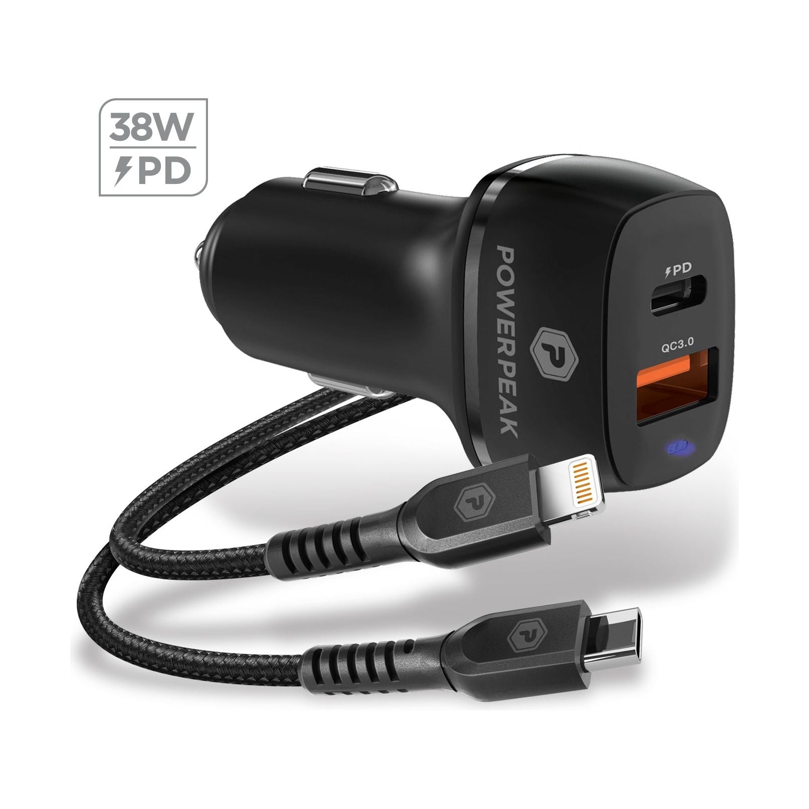 PowerPeak Dual Port Fast Charge PD Car Charger W/USB-C To Lighting [30W] - Black