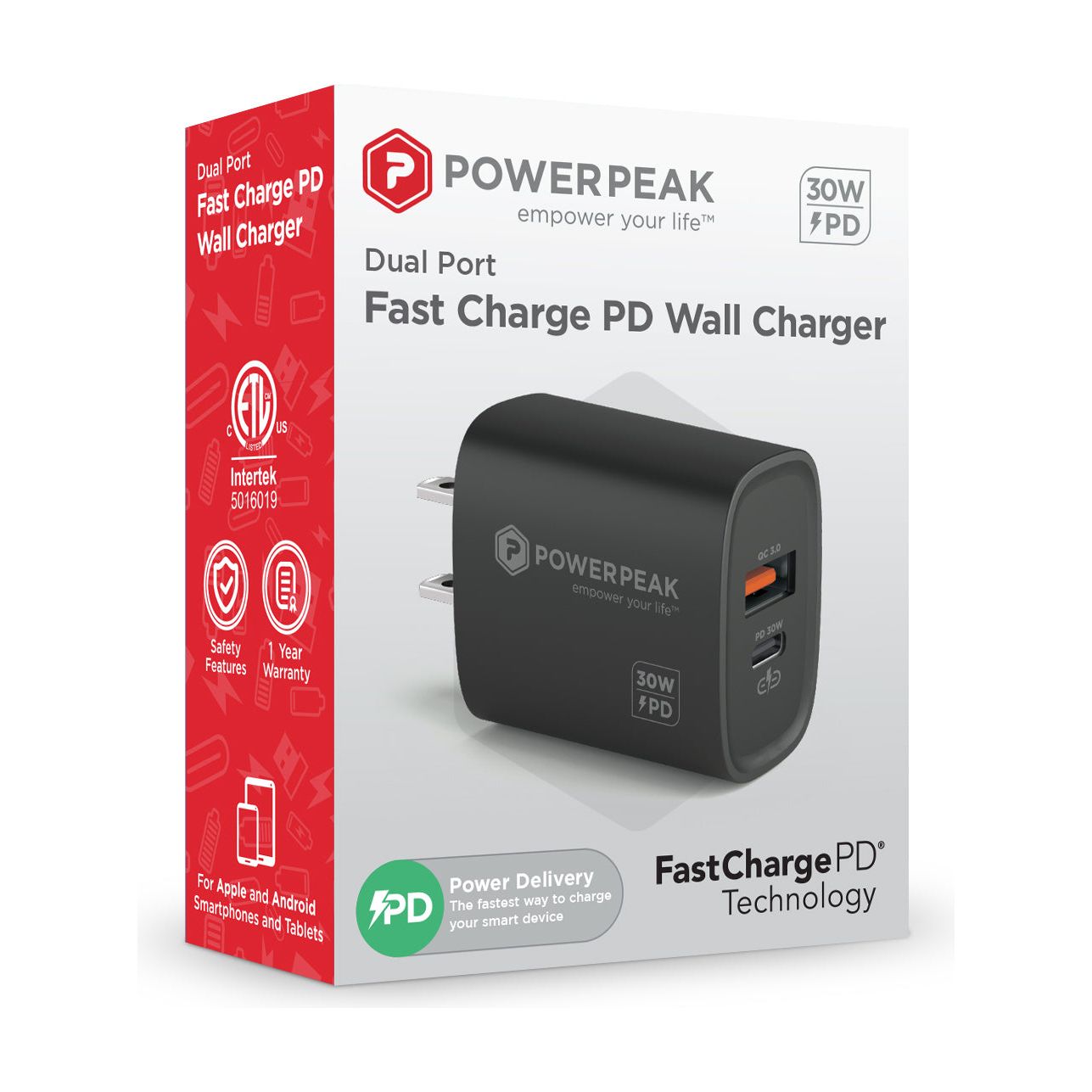The latest charging technology, experience the benefits of a PD Ultra-Fast charge with your new PowerPeak Dual Port PD wall charger. This charger intelligently allocates the appropriate power to give your device the optimal and quickest charging speed